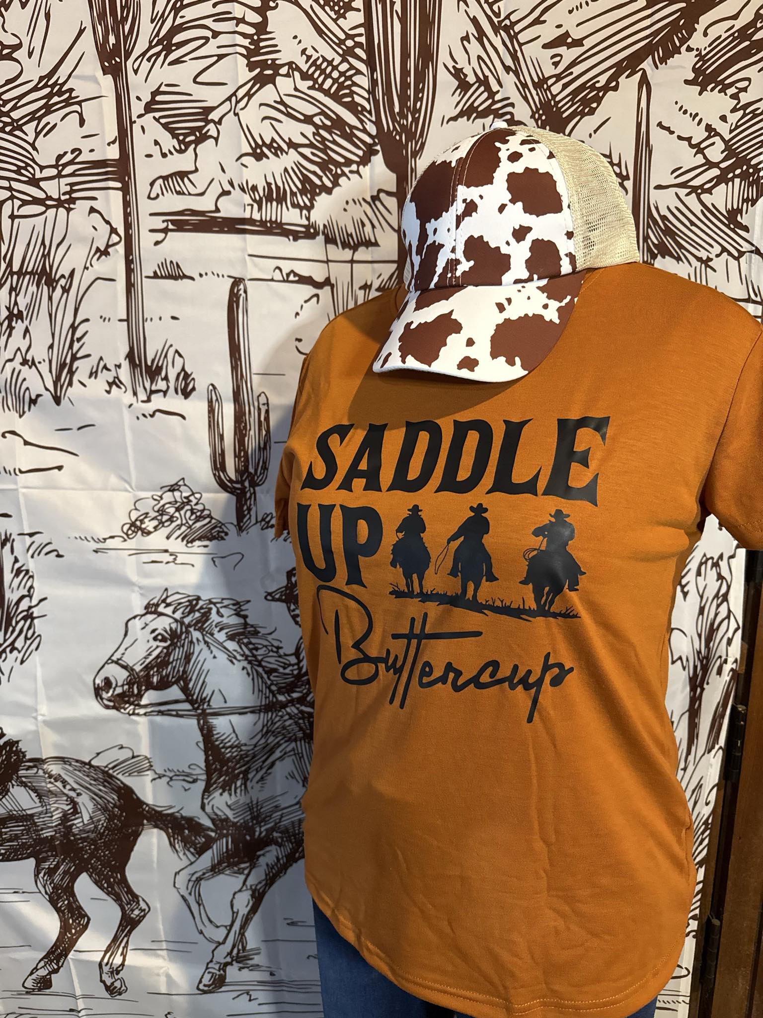 Top off your western look with our Cowprint Mesh Trucker Hat — a must-have for any rodeo-ready wardrobe. This lightweight hat features a bold cowprint pattern up front and a breathable beige mesh back for all-day comfort. Adjustable snapback makes it a perfect fit for any head size. Style it with tees, tanks, or flannels for the ultimate wild west vibe.