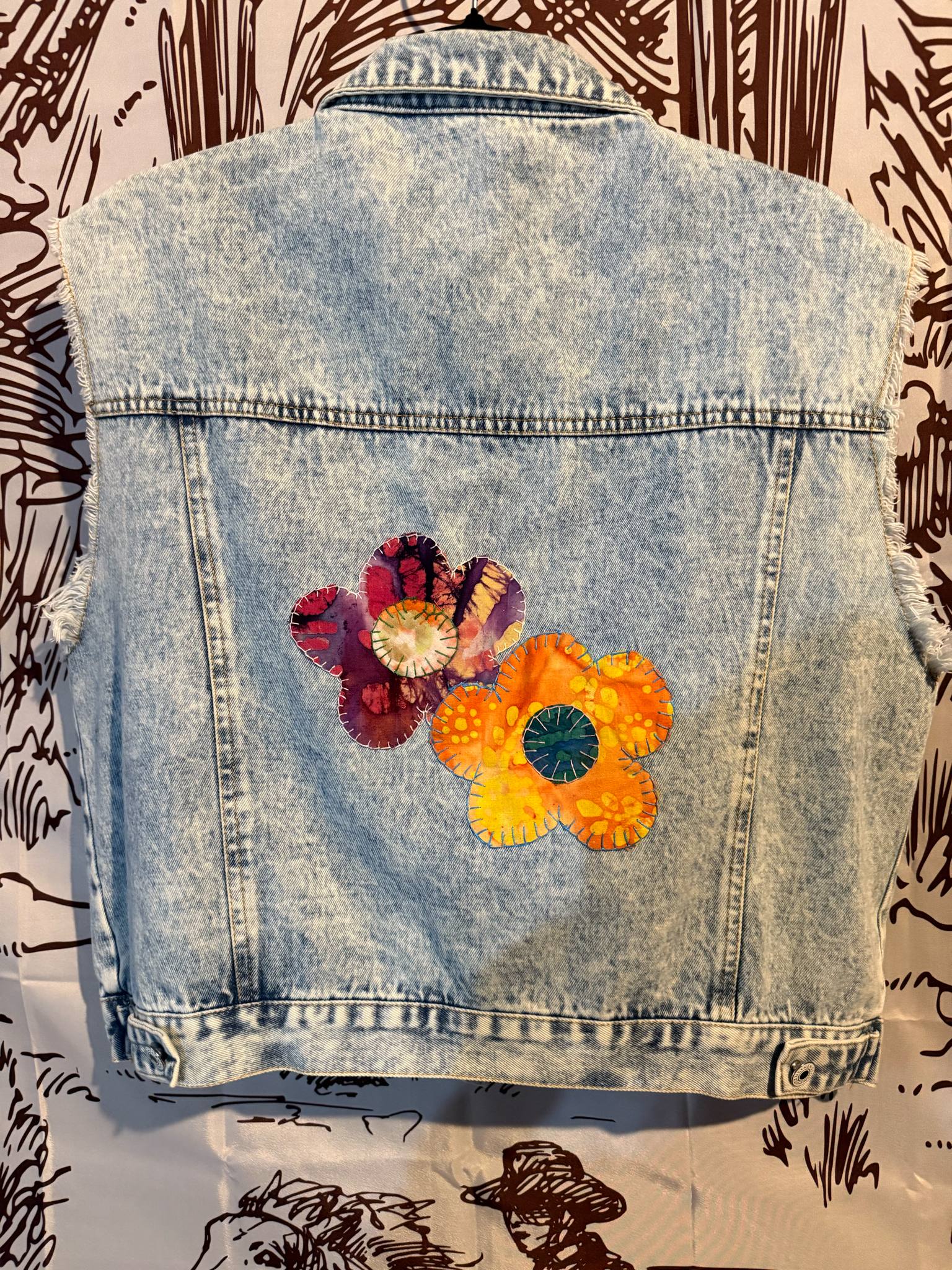 The Retro Flower Power Vest from the Cindy Owen "Defined Denim" Collection is made for bold spirits and boho souls. This one-of-a-kind XXL denim vest features hand-appliquéd vintage-inspired flowers in bright, punchy hues—front and back. With frayed armholes, sturdy button closures, and a light acid-wash finish, this vest is as timeless as it is unique. Throw it over a sundress, tee, or tank and let your wildflower side bloom.