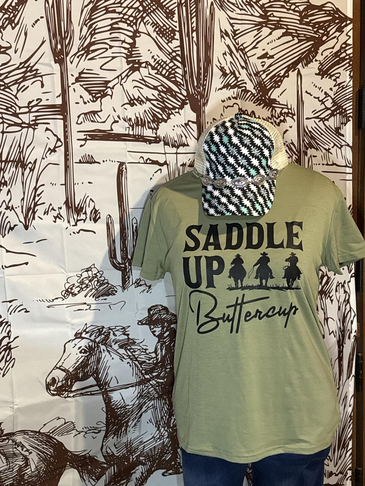 Keep it classic and cowboy-cool in our Saddle Up Buttercup Tee in sage green. This soft, breathable tee features a bold black Western graphic with rider silhouettes and script that speaks your cowgirl mindset. Unisex fit for effortless styling — perfect for layering or wearing on its own with jeans, boots, or cutoffs. Saddle up, and show the world who’s in charge. Size large.