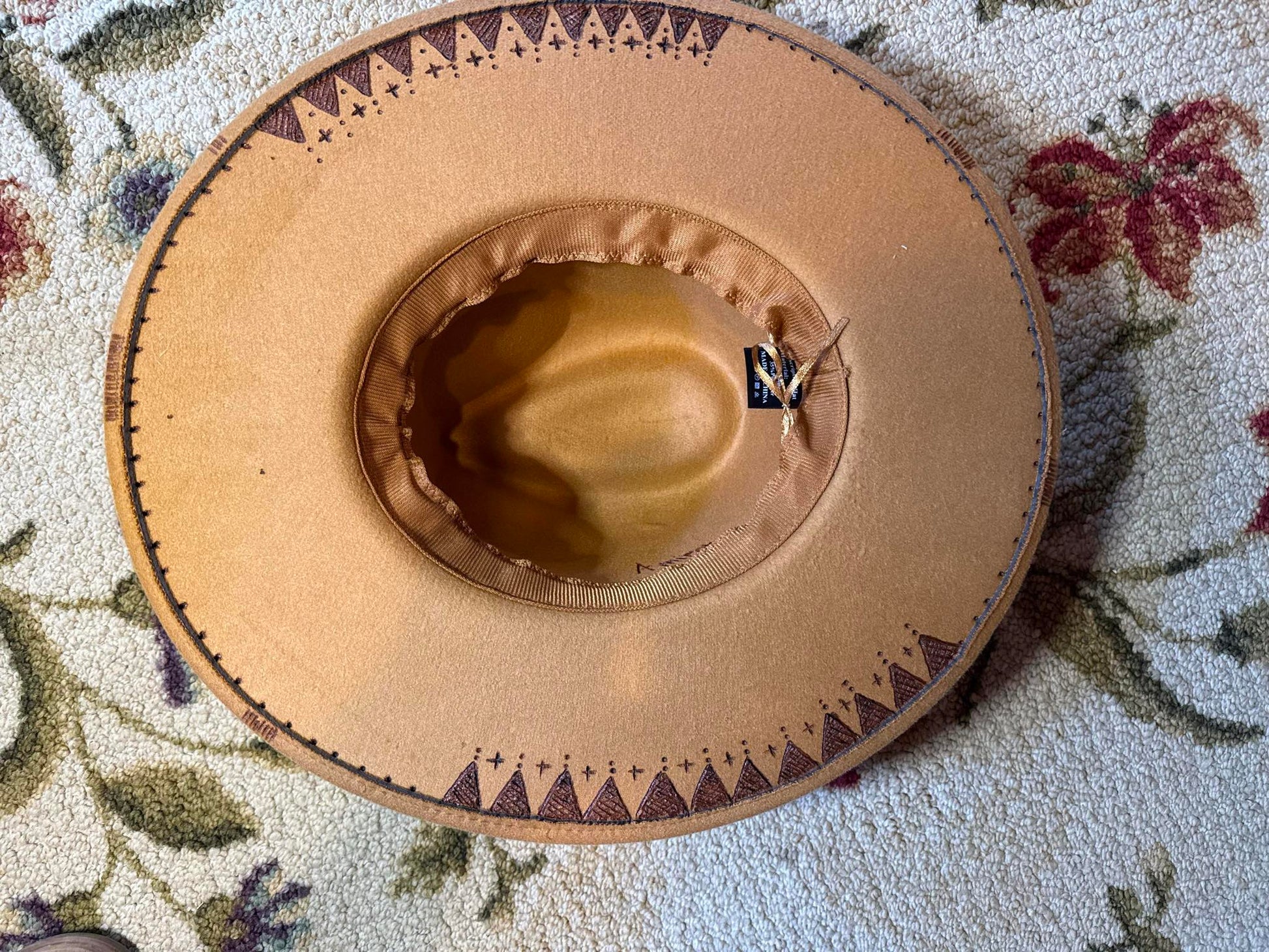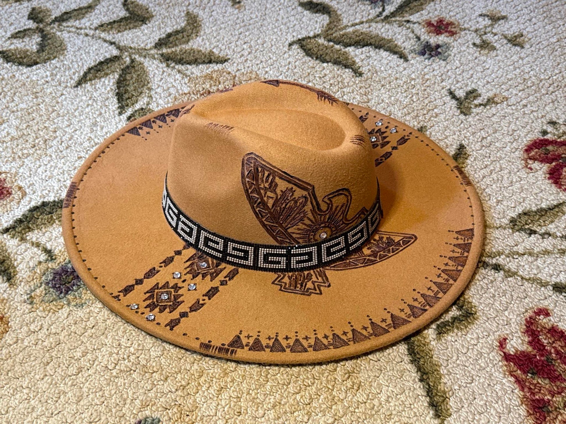 Let your bold spirit soar with the Thunderbird Wide Brimmed Fedora, a hand-burned masterpiece from the Amira Collection. Crafted with precision by Amira Baass, this one-of-a-kind adjustable fedora features intricate tribal-inspired etchings, dazzling rhinestone details, and a powerful thunderbird design that wraps around the crown. Accented with a striking black-and-white beaded hatband, this wide brim beauty is more than a hat—it’s a vibe. Each design is burned and painted freehand—no stencils, just soul.