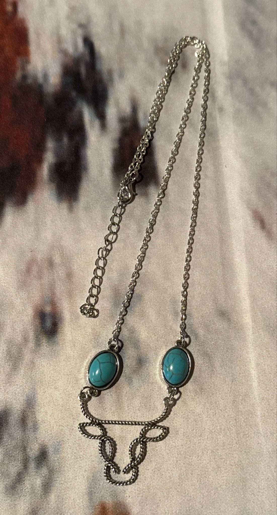 Turn heads and show your wild side with the Turquoise Longhorn Statement Necklace. This silver-tone piece features a twisted metal longhorn outline and two bold turquoise stones that bring the perfect pop of western color. Lightweight and adjustable, it’s your new go-to for rodeo nights, concerts, or everyday cowgirl flair.